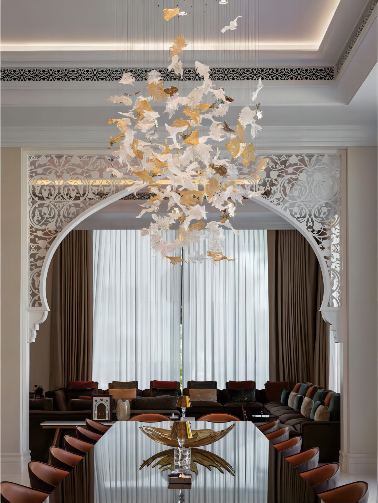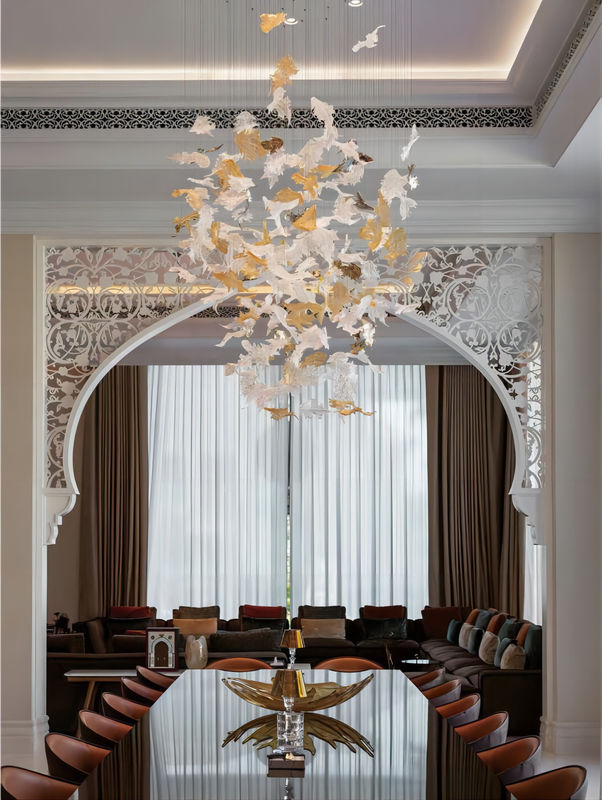 Deze op maat gemaakte kroonluchter is geïnspireerd op esdoornbladeren en combineert de elegantie van esdoornbladeren met verlichting om een zeer artistieke en decoratieve lamp te maken.Elk hangertje van esdoornbladeren is met fijn glas gemaaktDe totale vorm van de kroonluchter is elegant en uniek. Het is zowel een verlichtingsapparaat als een kunstwerk.perfect integreren in het decoratieve thema van de banketzaal.